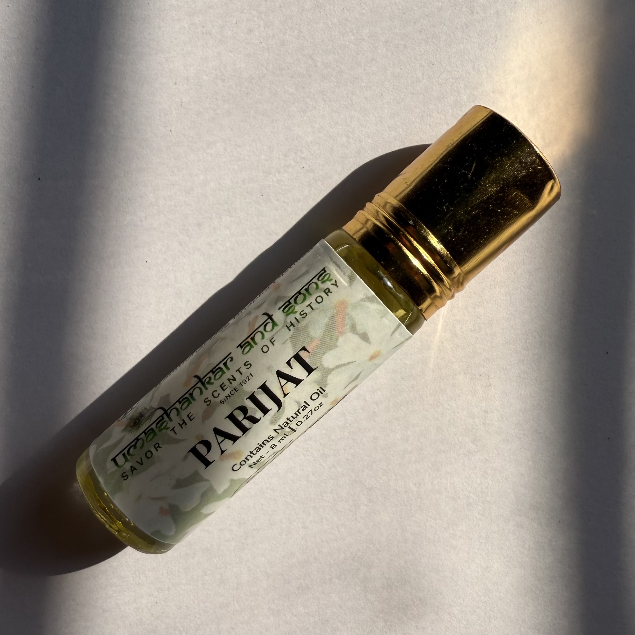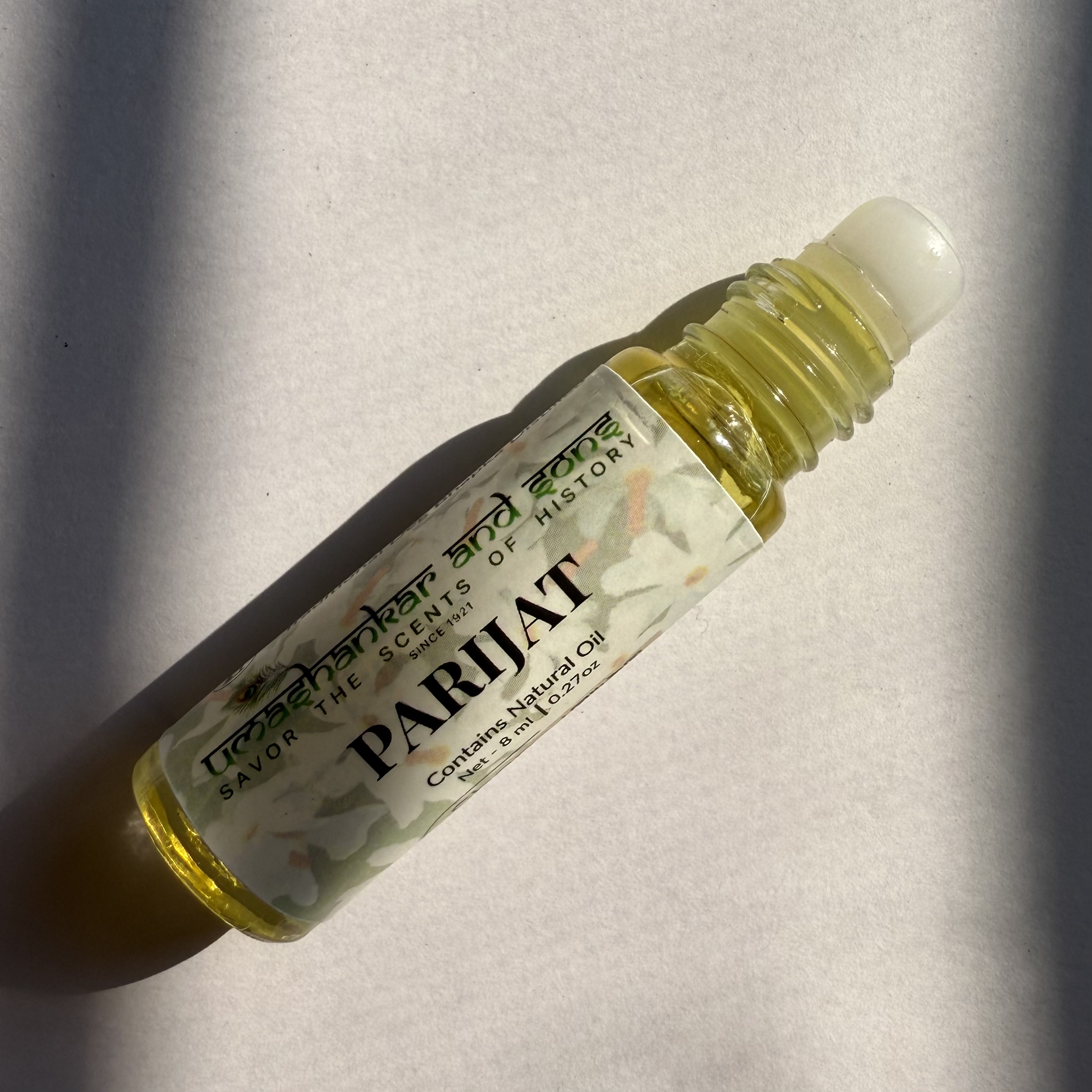Pure Parijat Attar, traditionally distilled in Vrindavan—alcohol-free, long-lasting, and perfect for pooja, meditation, and daily wear