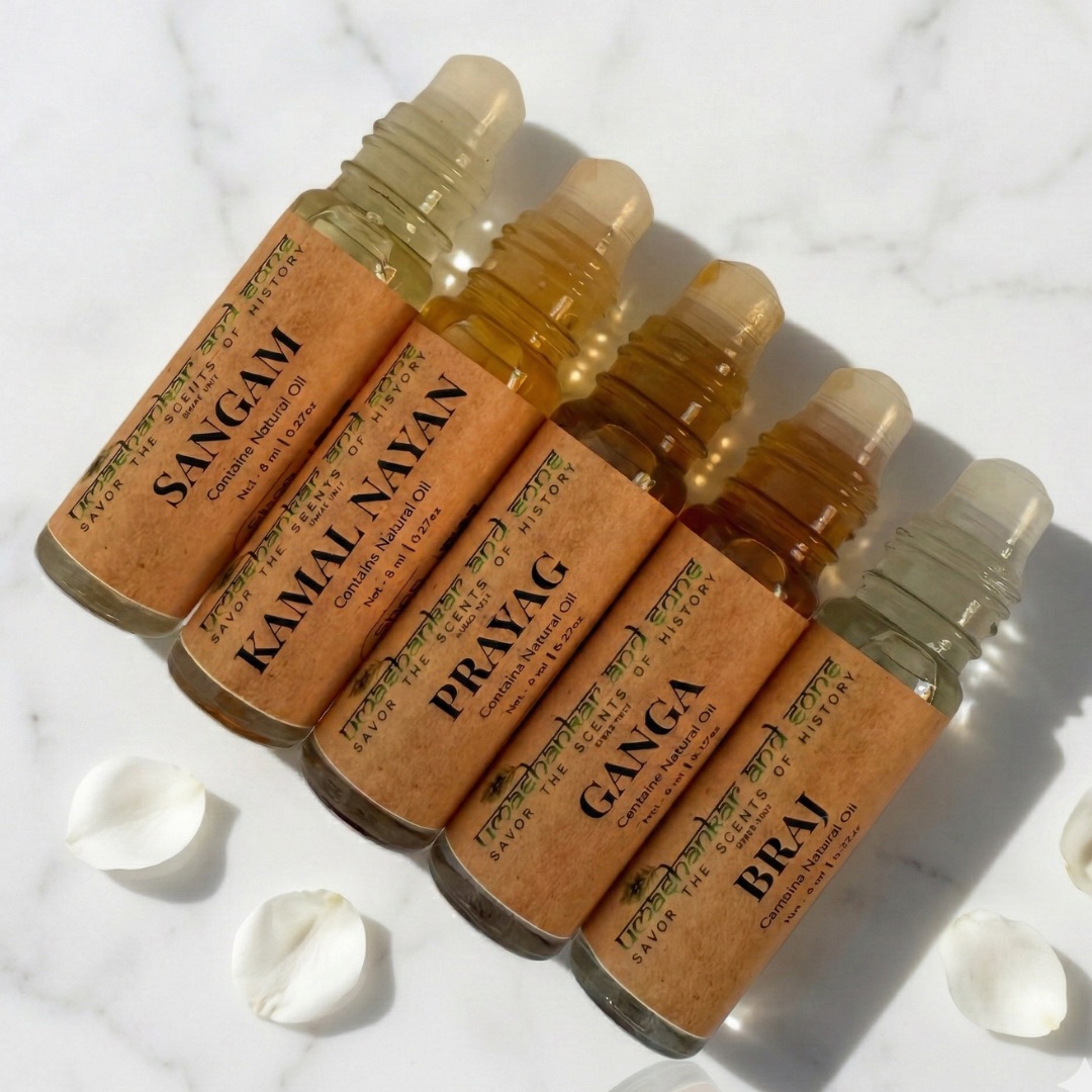 Sangam, Kamal Nayan, Prayag, Ganga, Braj Attar, traditionally distilled in Vrindavan—alcohol-free, long-lasting, and perfect for pooja, meditation, and daily wear