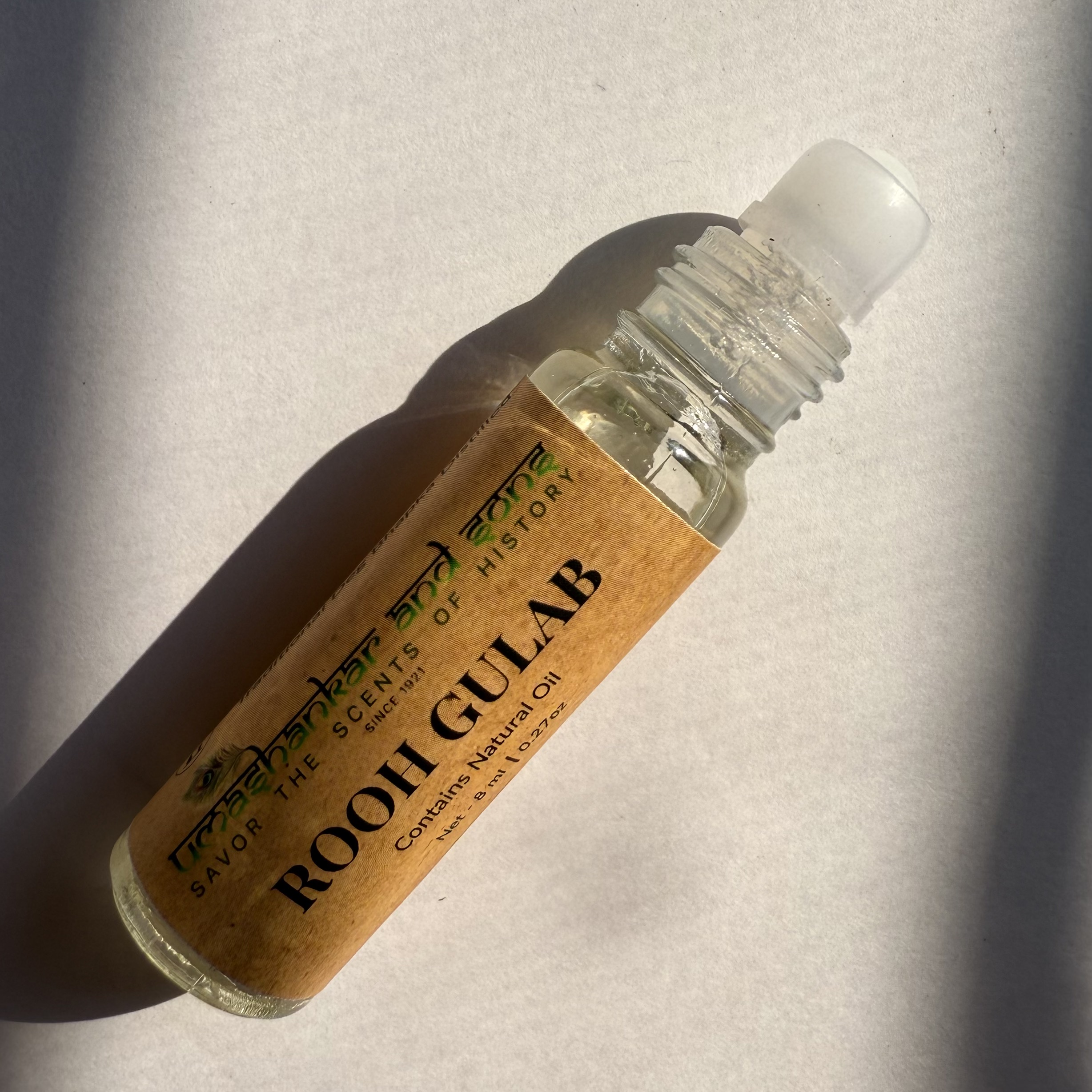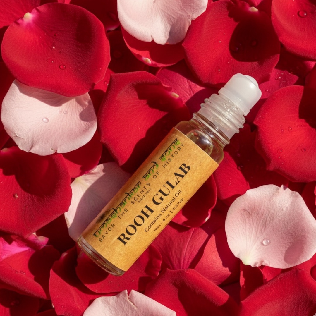 Pure Rooh Gulab Attar, traditionally distilled in Vrindavan—alcohol-free, long-lasting, perfect for pooja, meditation, and daily wear