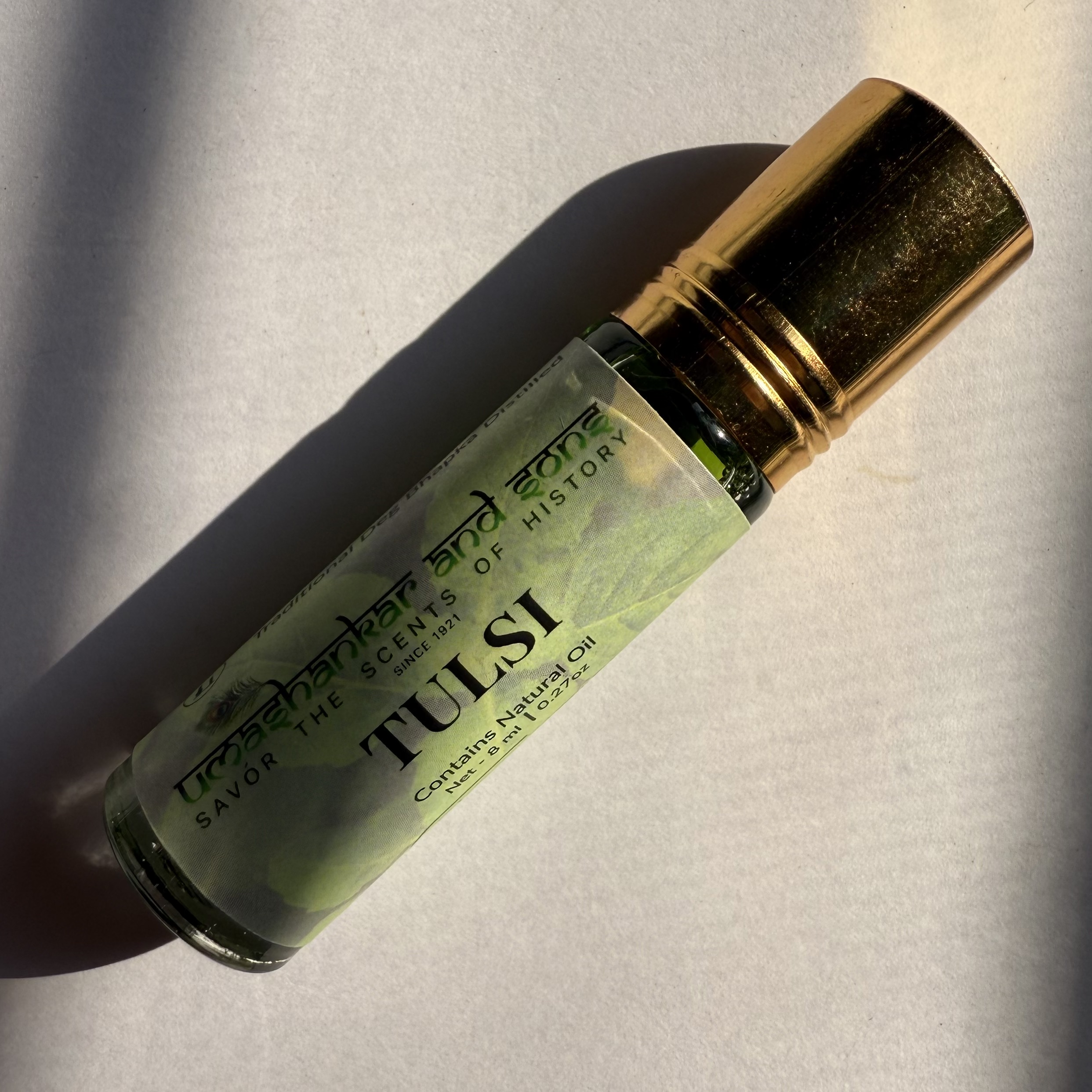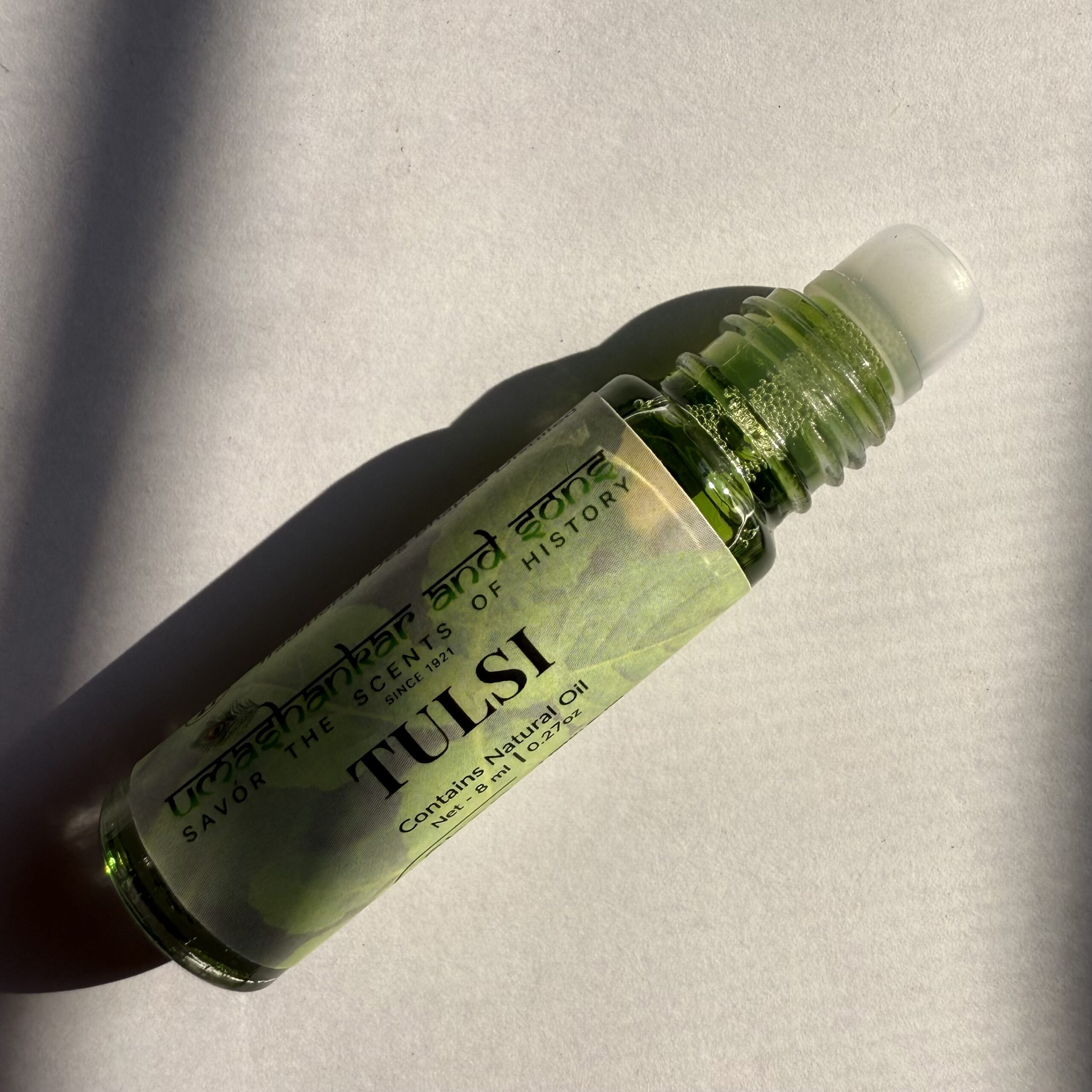 Pure Tulsi Attar, traditionally distilled in Vrindavan—alcohol-free, long-lasting, and perfect for pooja, meditation, and daily wear