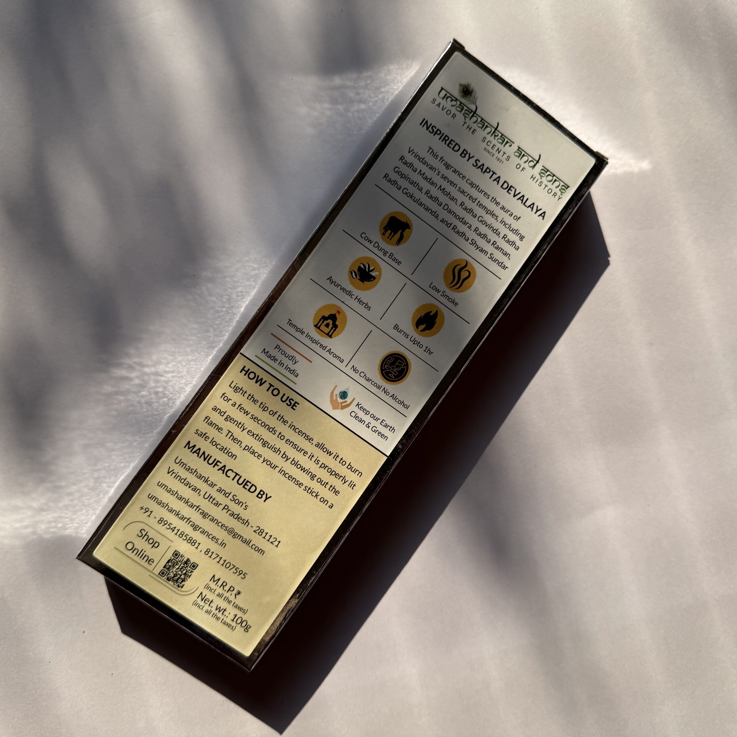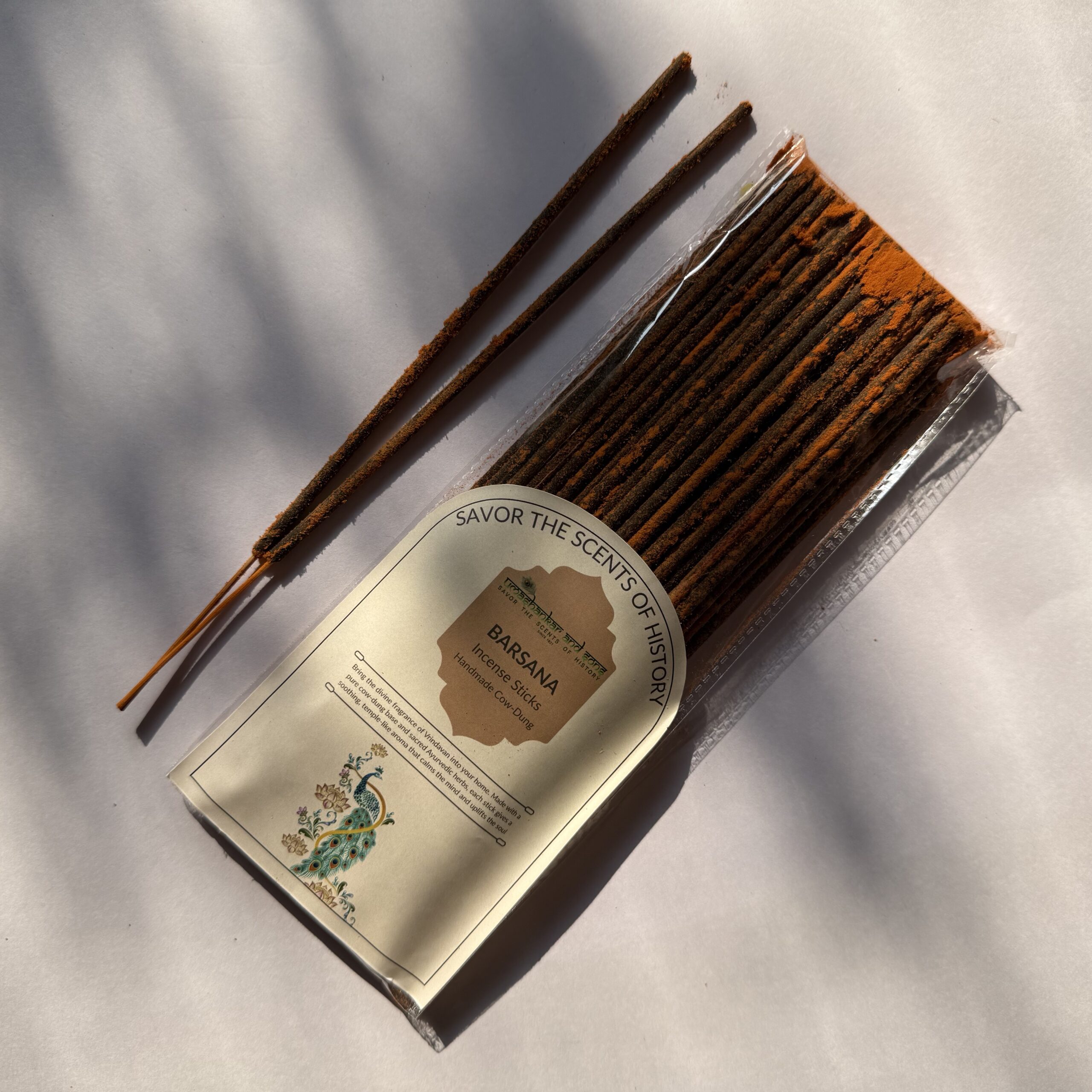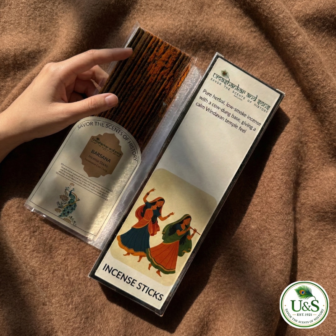 Pure Barsana Incense Sticks, handcrafted in Vrindavan using pure cow dung and natural herbs—alcohol-free, long-lasting aroma, ideal for pooja, meditation, and everyday spiritual ambiance