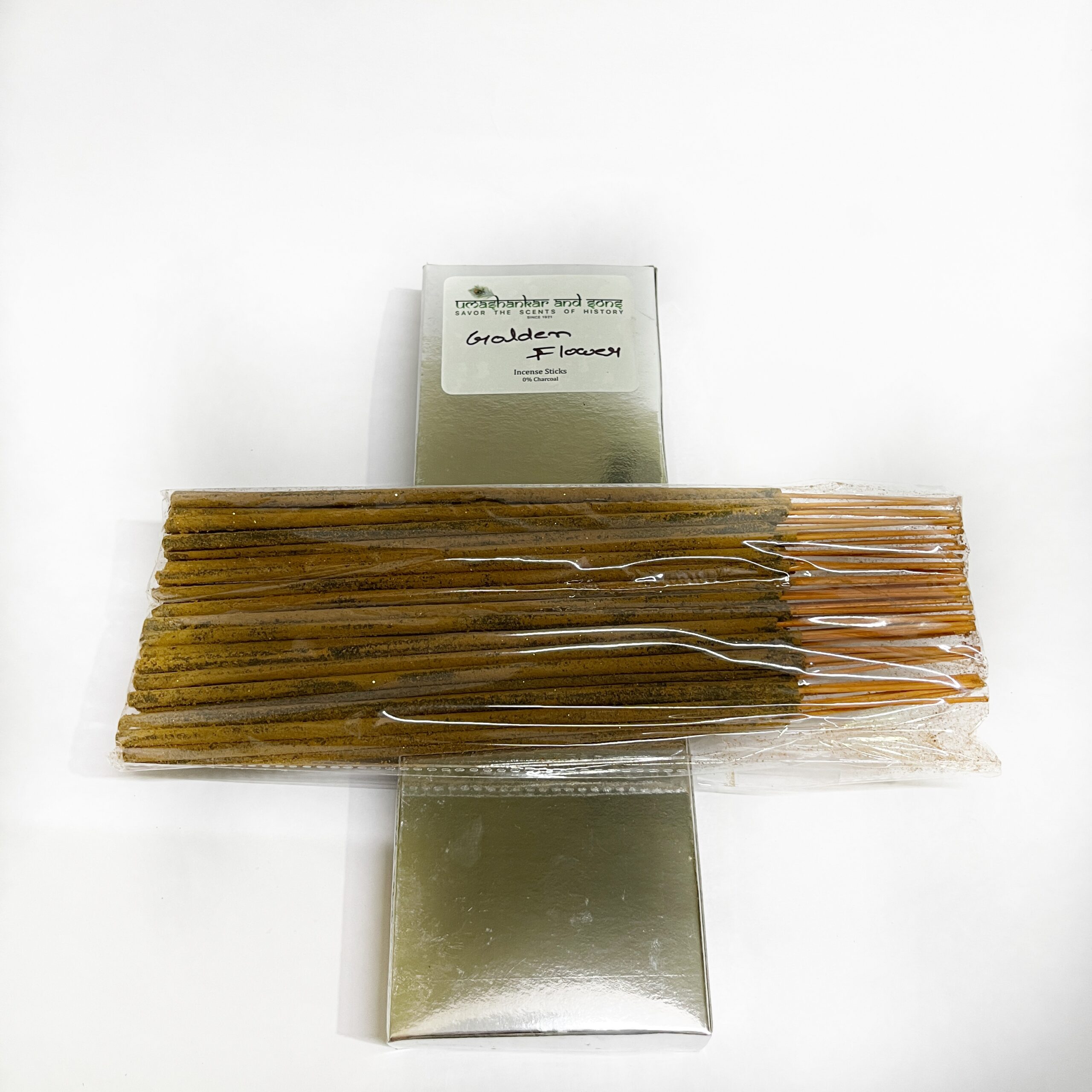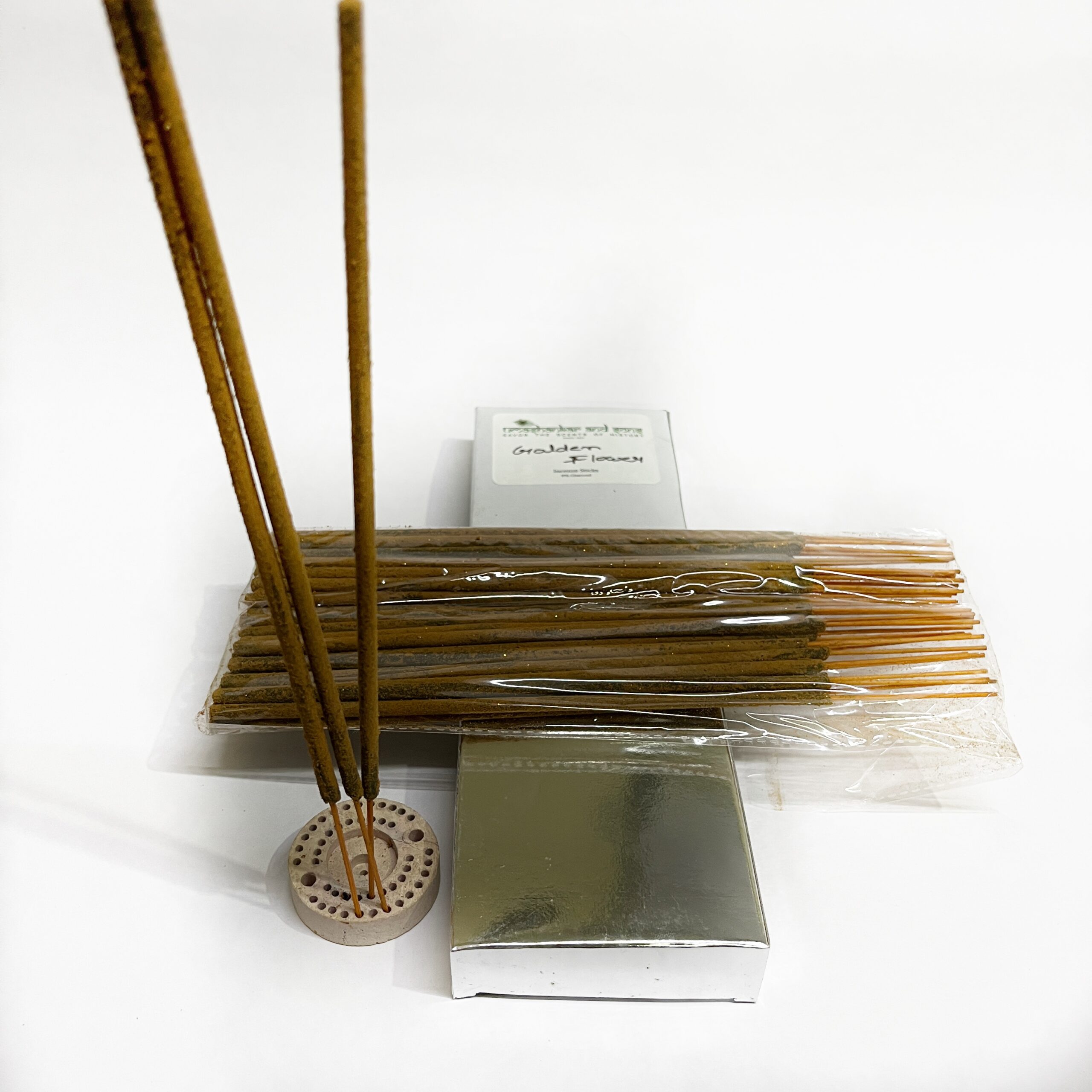Pure Golden Flower Incense Sticks, handcrafted in Vrindavan using pure cow dung and natural herbs—alcohol-free, long-lasting aroma, ideal for pooja, meditation, and everyday spiritual ambiance