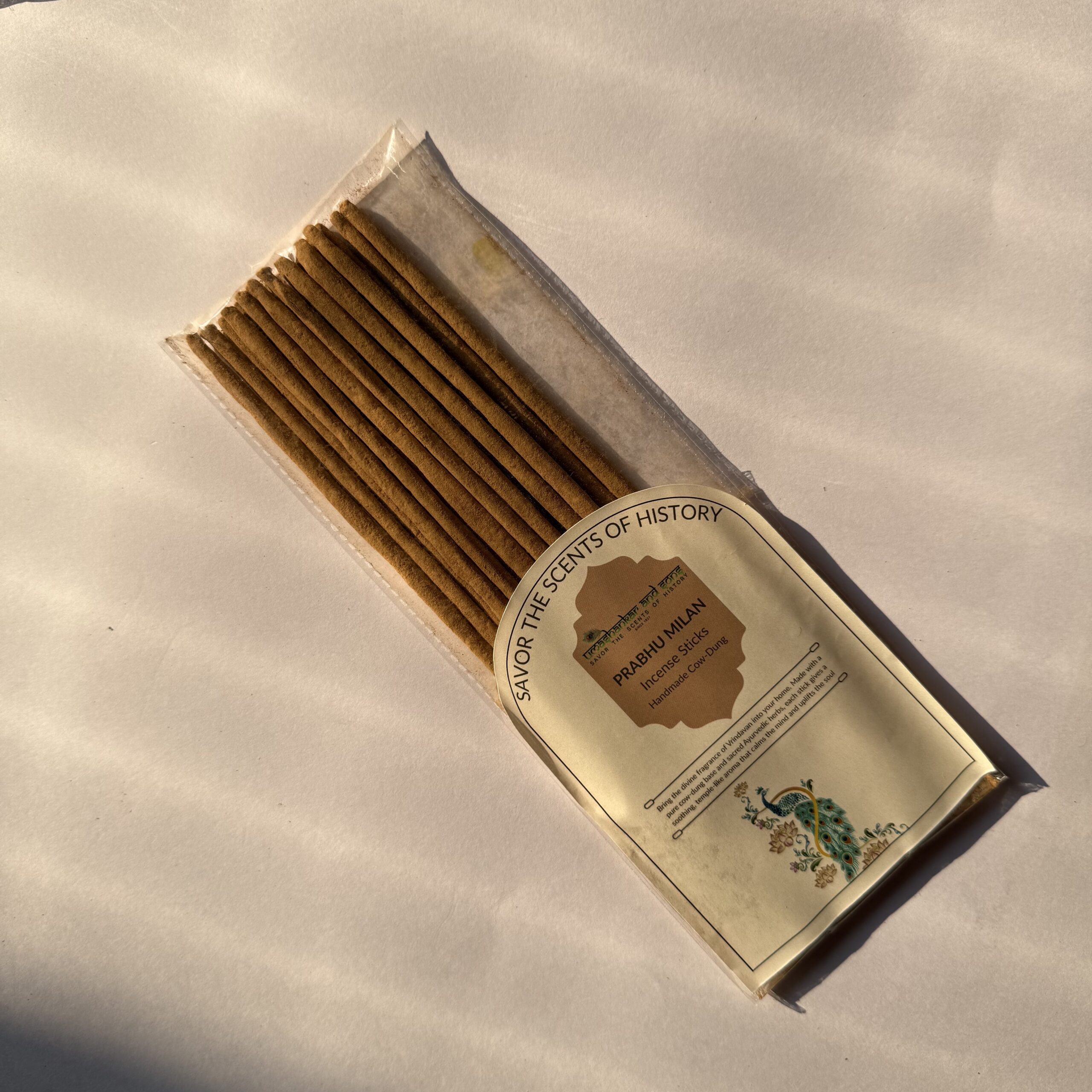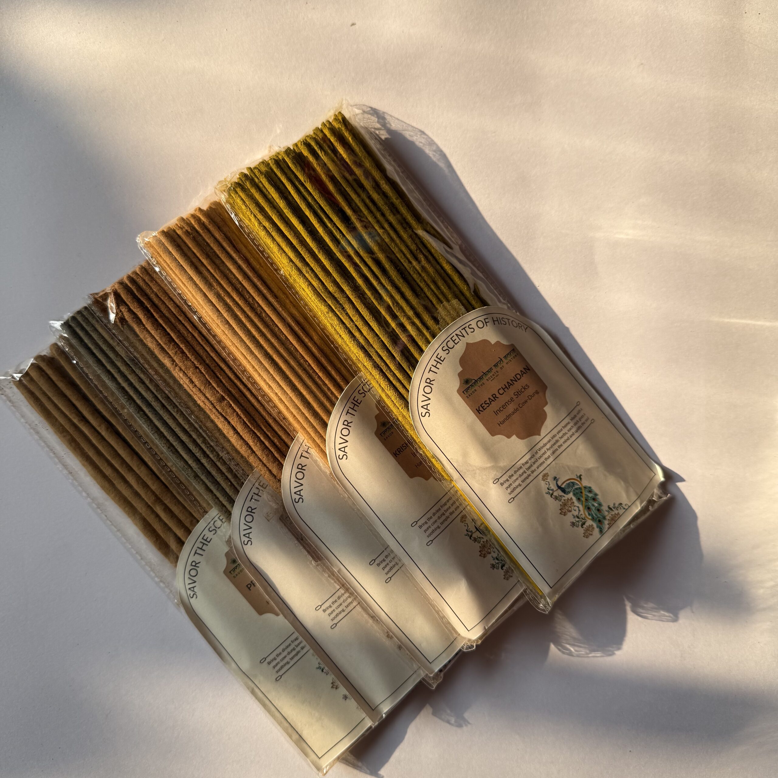 Kesar Chandan, Vrindavan Flower, Kamal Nayan, Prabhu Milan, Krishna Balaram Incense Sticks, handcrafted in Vrindavan using pure cow dung and natural herbs—alcohol-free, long-lasting aroma, ideal for pooja, meditation, and everyday spiritual ambiance