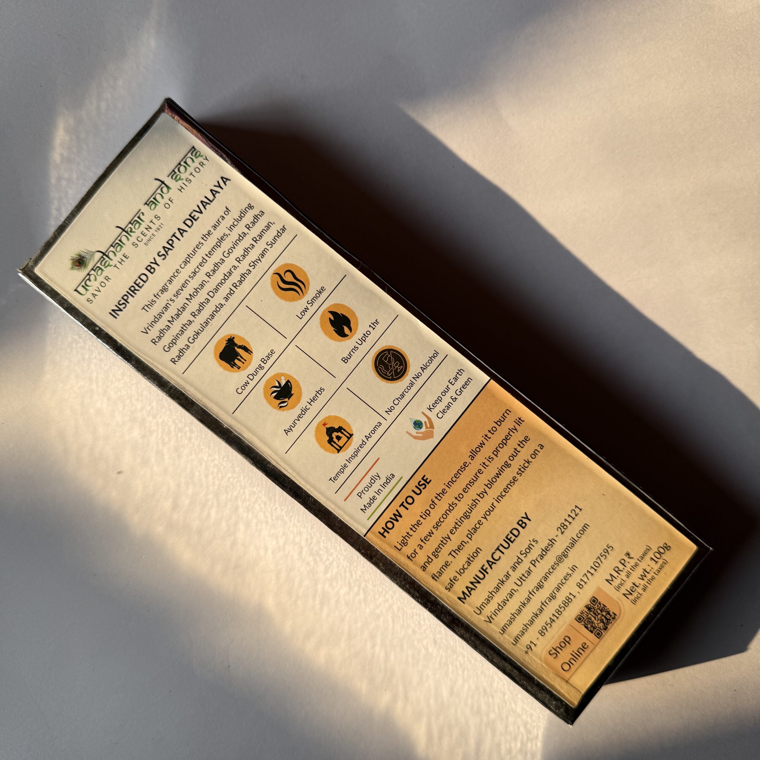 handcrafted in Vrindavan using pure cow dung and natural herbs—alcohol-free, long-lasting aroma, ideal for pooja, meditation, and everyday spiritual ambiance